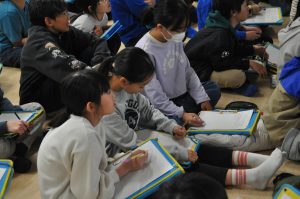 前半の話では、身を乗り出して聞いている男子、国旗を見て描き移す女子など、反応がとてもよい子どもたちでした。