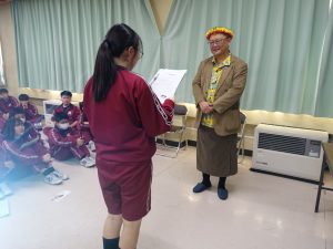 場所は、1年生全員ということで体育館かなと思っていたのですが、視聴覚室でした。やや狭かったのですが、ケンタロさんと生徒のみなさんの距離感が近くて、コミュニケーションを取りながらの講話となりました。
