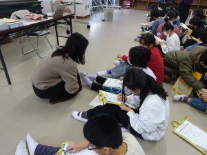 後半は、家族の備えを考えるワークショップです。家族一人一人の顔を思い浮かべながら、食で困っていること、備えるものを考えてワークシートに書き出していきました。なかなか進まない子供たちには、講師の佐藤さんや先生方がアドバイスをしていました。