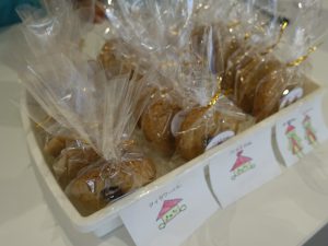 一つのグループは、地域にある、知る人ぞ知る「笑m CAFE」さんのクッキー販売です。子供たち自らが交渉に行って仕入れてきたそうです。クッキーとともに、長命ケ丘小学校のキャラクターシールも渡しました。まちづくりスポット仙台の前で呼び込みをした結果、30個が完売しました。