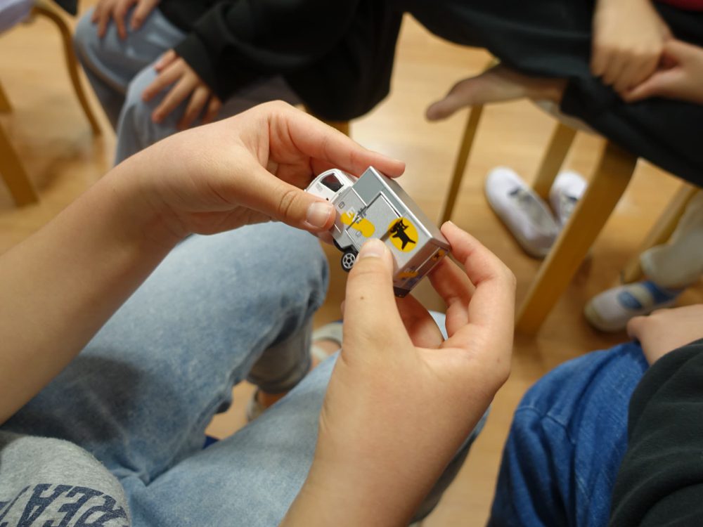 環境問題、ヤマト運輸の紹介、環境への取り組みなど、子どもたちは話をよく聞いていました。途中、ヤマト運輸のEVカーのミニカー(非売品)が渡され、手に取っていました。