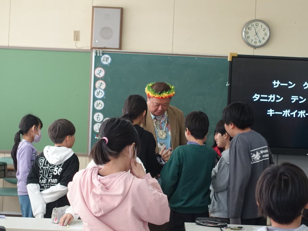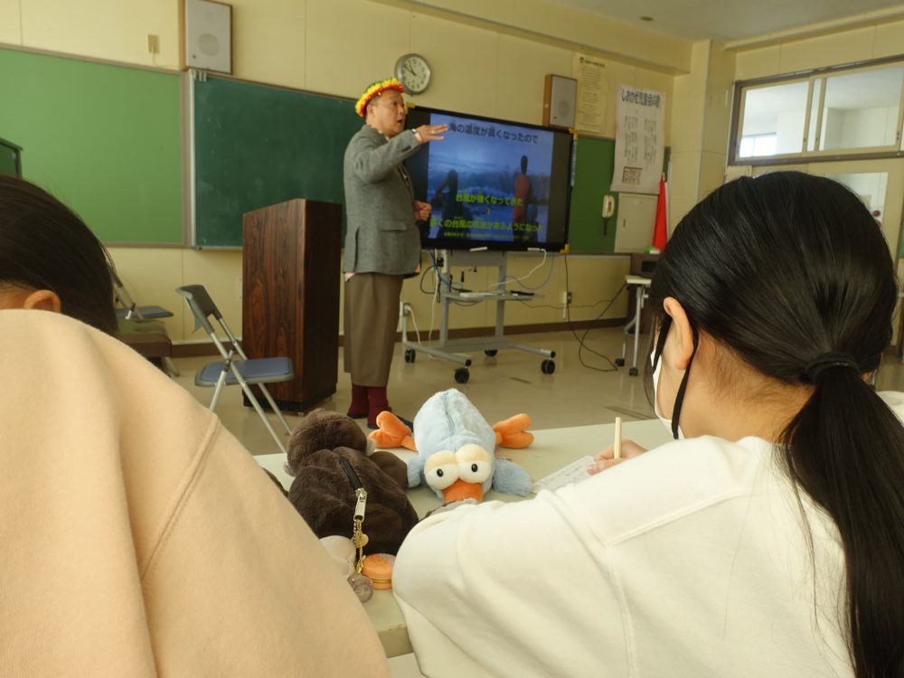 前半は、いつものように地球温暖化の話はまったくなく、ケンタロさんの生い立ち、キリバスの生活や文化、そこに暮らす人たちの話です。笑いが起こる中、揺れを感じました。地震です。子供たちはすぐに机の下にもぐって身の安全を確保しました。揺れが収まった後、校内放送で、津波警報が出たとのことが知らされました。家にいる祖父母のことを心配する子など、子供たちに動揺が見られましたが、先生方が対応しました。